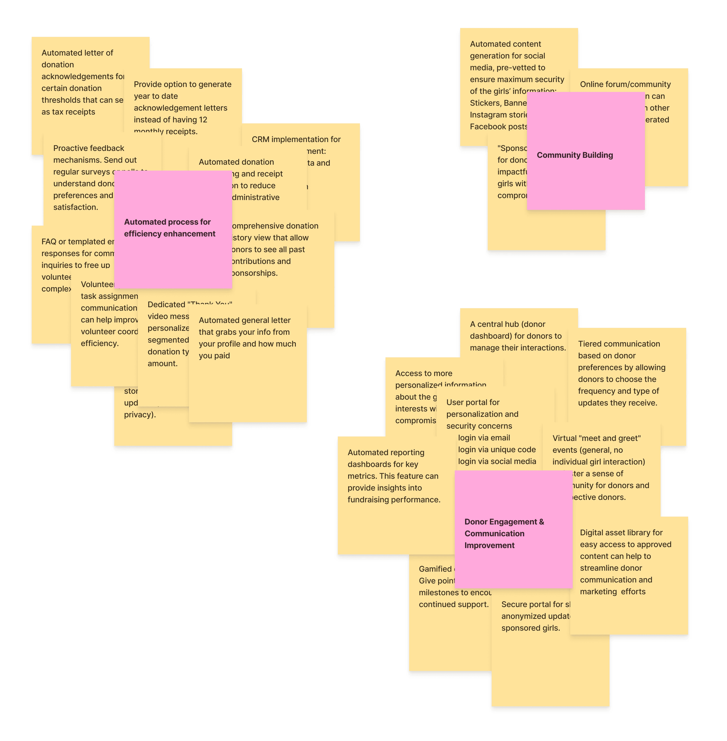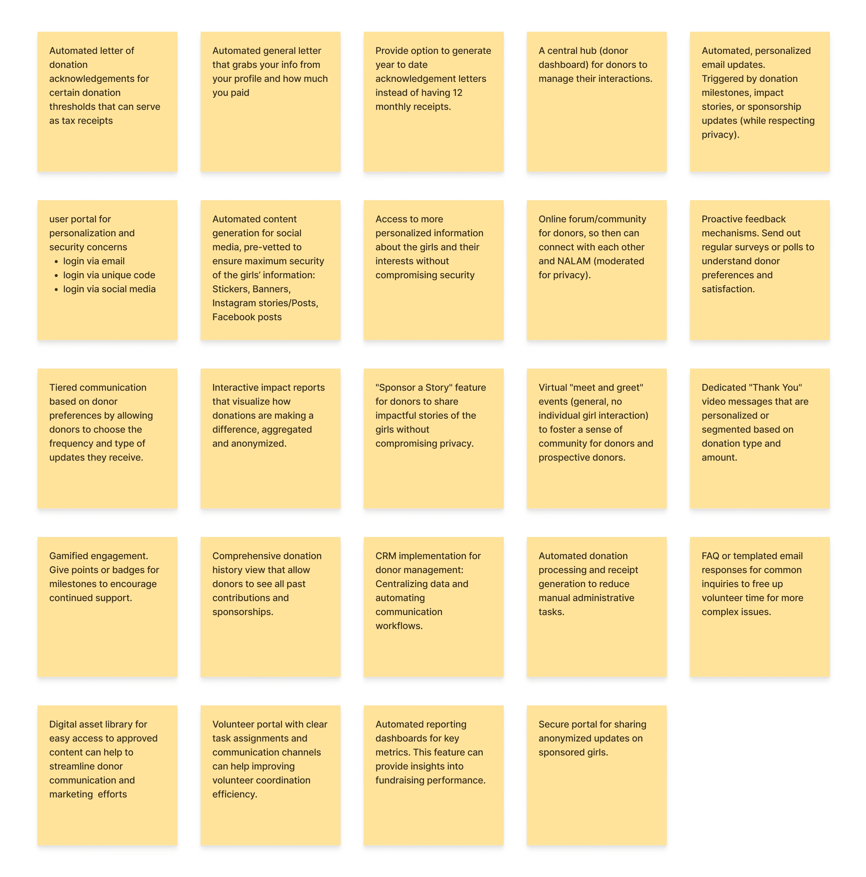 To address the challenge of enhancing donor engagement and relieving administrative burden for NALAM, our team conducted a brainstorming session to generate a wide range of ideas and possible solutions that could be further evaluated and prioritized.